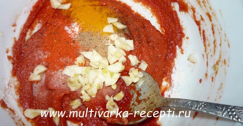 В отдельной посуде готовим соус: томатную пасту хорошо перемешиваем с мукой, солим, перчим, добавляем рубленый чеснок, другие специи. Я использовала по 0,5 чайной ложки мускатного ореха, куркумы, молотой паприки. Все это заливаем водой и перемешиваем.