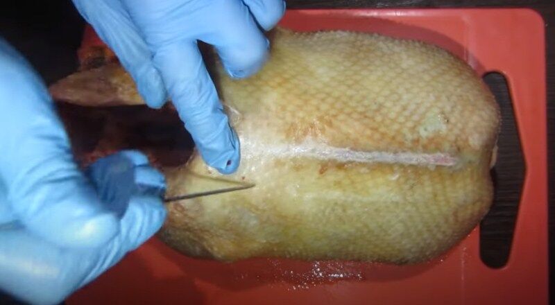 - Обрезать жир, сконцентрированный у брюшка и вокруг шеи. Это делают, чтобы избавиться от неприятного запаха, который иногда исходит от старой птицы.