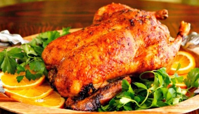– Отправьте птицу в духовой шкаф. Время приготовления при 200 градусах составит около двух часов. Проверить готовность мяса можно ножиком. Если он хорошо входит, и при надрезе вы видите выделяющийся сок – птица готова.