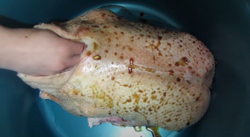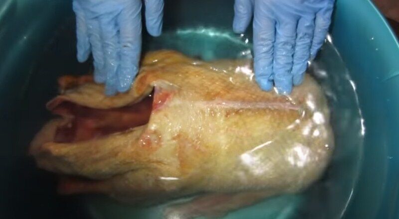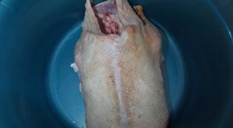 - Вымыть и почистить тушку. Птица продается уже ощипанной, но небольшие пеньки от перьев могут остаться. От них нужно избавиться. Сделать это можно поместив птицу в кастрюлю с теплой водой. Шкура немного размякнет и пеньки можно будет вытащить при помощи пинцета.