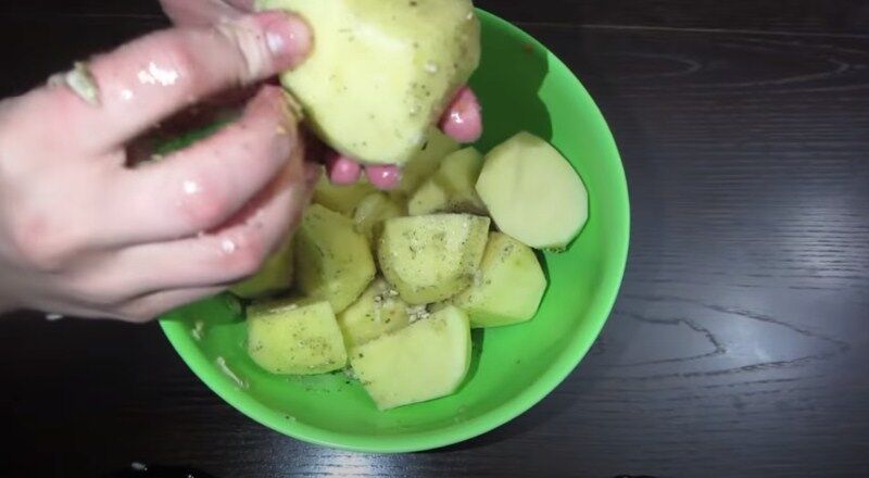 Далее овощ тоже нужно замариновать. Поливаем его небольшим количеством растительного масла, приправляем всевозможными специями и добавляем измельченные 3 зубчика чеснока. После хорошо натираем картофель получившейся смесью и оставляем ее в таком виде минут на 15.