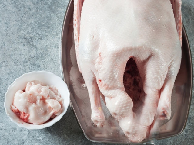 Перед приготовлением тушку нужно обработать, вырезать жировик, убрать остатки перьев и опалить.