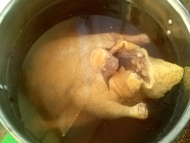 1. Промыть тушку и вырезать у нее гузочный жир. Поставить на плиту кастрюлю, опустить в нее птицу и залить водой так, чтобы уровень был выше минимум на 2 пальца.