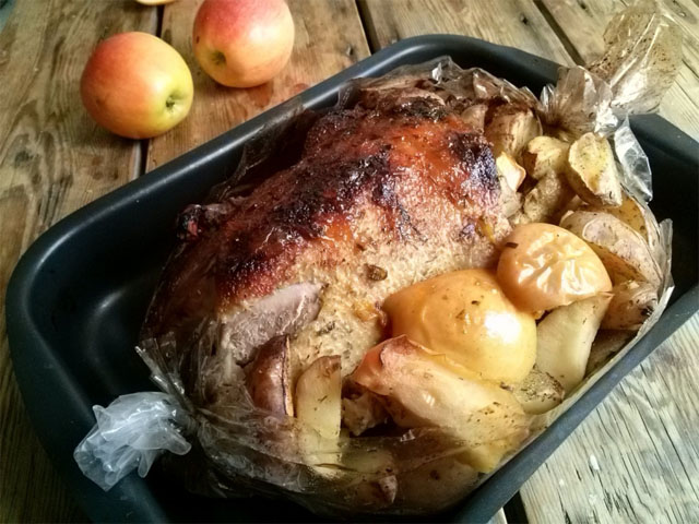 Также получится великолепный гарнир, если вместе с птицей в пакет для запекания сразу уложить картофель с яблоками, нарезанными крупными кусками.