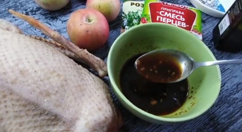 Натереть полученной массой гуся. Завернуть в пакет, вынести на холод минимум на 10 часов.