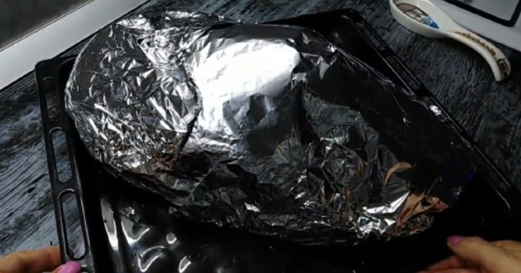 Упакованное лакомство разместить на противне и запекать в разогретой до 180 градусов духовке часа полтора.