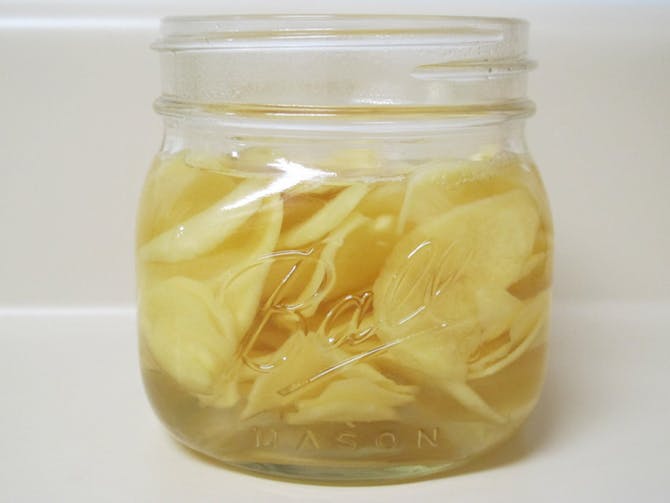 Простейший маринад готовится на основе рисового или сливового уксуса, с добавлением сахара и соли по вкусу. В крайнем случае, можно применить даже обыкновенный винный уксус, но это немножечко повлияет на вкус будущего маринованного корешка. Говорят, что польза от свойств имбиря возрастет, если в маринад долить пару столовых ложек красного сухого вина.