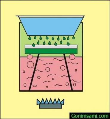 - По жидкости. Охладившаяся флегма «верхних этажей», капая с холодильника, отбирается через наклонные плоскости или отстойник.
