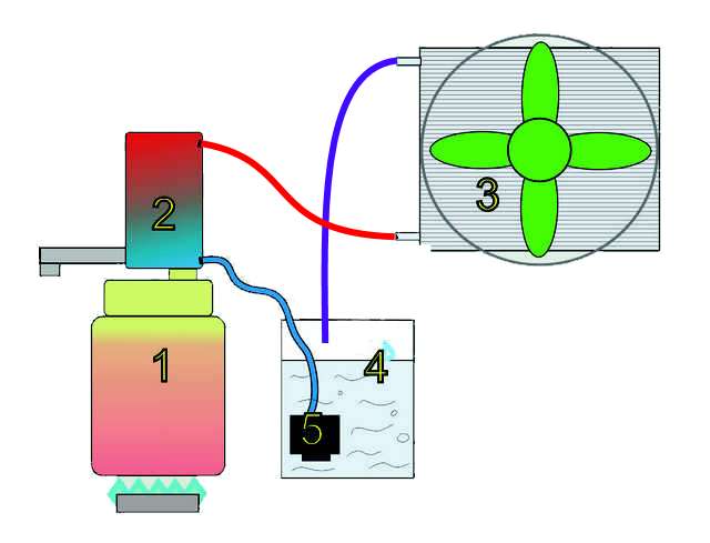 1 — Перегонный куб. 2 — Холодильник. 3 — Радиатор с вентилятором. 4 — Канистра с водой. 5 — Водяной насос.