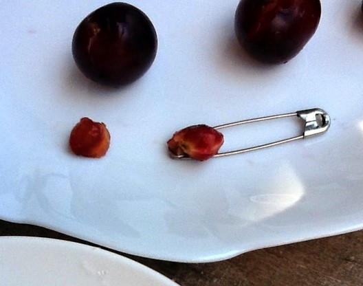 Ягоду нужно удерживать пальцами одной руки, а металлический аксессуар – другой. Булавочным ушком (не той стороной, где расстегивается, а обратной) или тупым концом скрепки/шпильки поддевают место сращения вишни с плодоножкой. Косточка очень быстро и легко вытаскивается.
