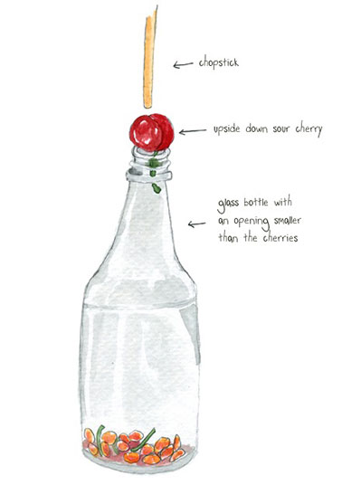 Положите вишню сверху на горлышко бутылки местом крепления черешка вверх.