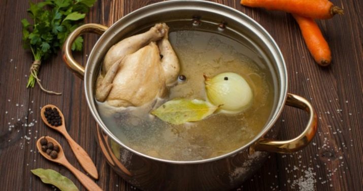 - Овощи и специи выбросить. Бульон процедить.