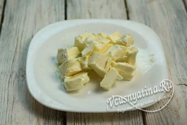 - Мягкое масло нарезать кубиками и добавить к яйцам с творогом;