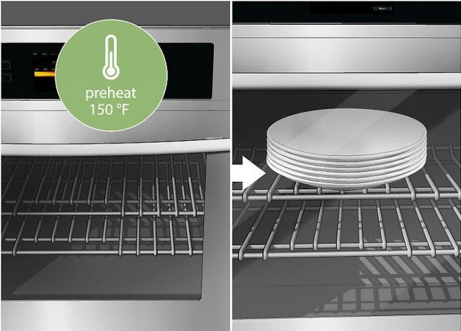 Если у вас нет микроволновой печи, вы можете разогреть тарелки в духовке. Для этого сначала прогрейте ее до 65-95 °C. Поместите в нее посуду на 2-3 минуты, а затем достаньте с помощью прихватки.