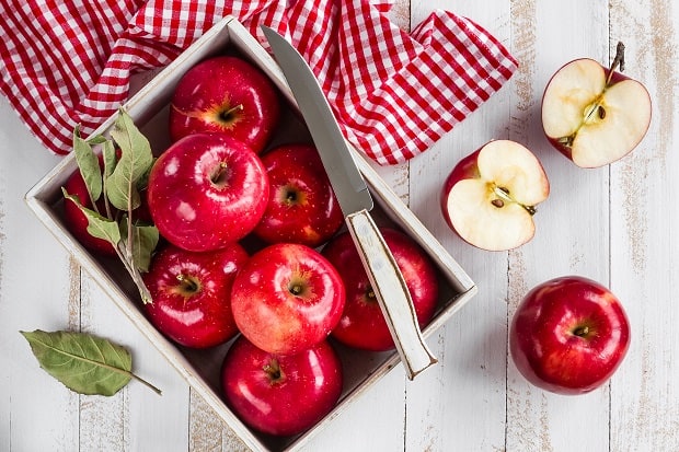 - Яблоки обладают невысокой калорийностью – до 45 – 47 ккал на каждые 100 грамм чистого продукта.