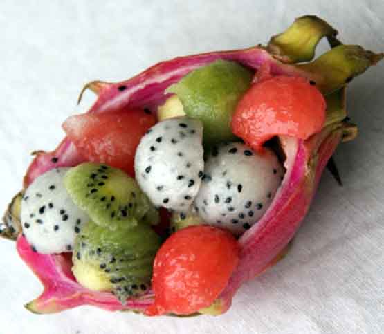 Плод можно есть по-разному. Самый простой способ – изъять мякоть ложкой и скушать в свежем виде. Съедобную часть можно нарезать произвольной формой, выкладывать в креманки. Питахайя идеально сочетается со сладкими, кислыми плодами, поэтому драконий плод – желанный ингредиент во фруктовых салатах, коктейлях, смузи.