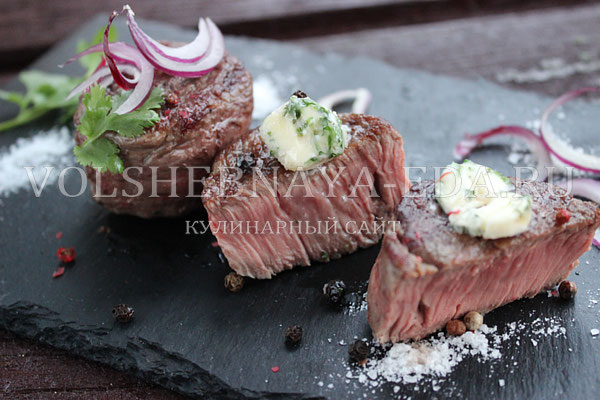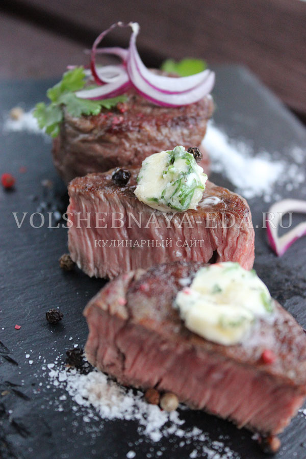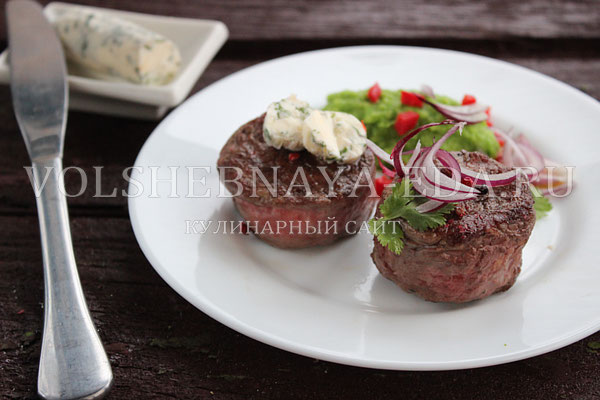 Заранее можно приготовить так называемое «зеленое» масло — соединить размягченное сливочное масло, соль, рубленую зелень, рубленый зубчик чеснока и немного лимонного сока, все перемешать до однородности, завернуть в пленку, как конфетку, и отправить в морозилку до застывания. При подаче выкладываем сверху на стейк небольшой кусочек масла, которое здесь играет роль соуса и элегантно облагораживает медальон, придает ему особый аромат и послевкусие.