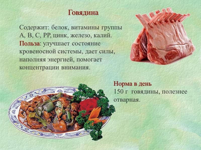 Говяжье мясо содержит массу ценных веществ, в числе которых находится железо и цинк, что очень важно для процесса кроветворения. Говядина положительно влияет на деятельность ЖКТ, укрепляет стенки сосудов, выводит вредный холестерин