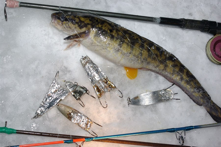 Со льда ловят также и на искусственные приманки — блесны. Блеснят налима в местах его скоплений, на глубоких озерах, в ямах на повороте реки