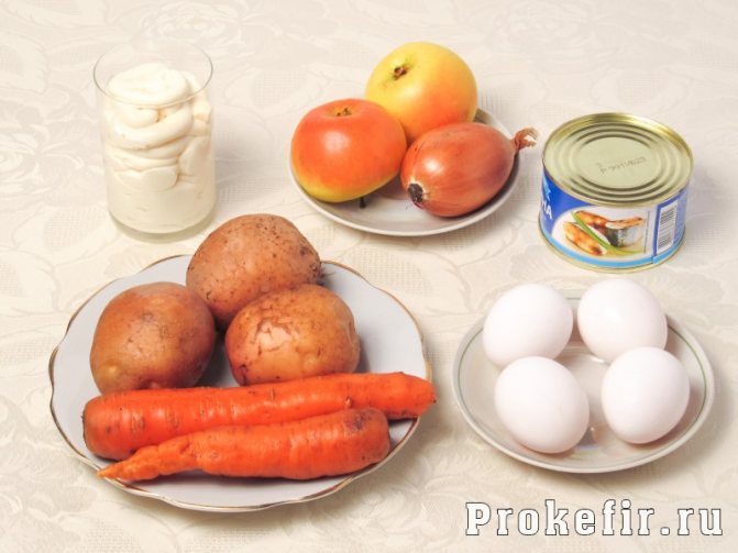 Вначале нужно тщательно вымыть картошку и морковку и отварить их до готовности. Яйца отварить вкрутую. Овощи и яйца охладить и почистить. Разделить желтки и белки. Яблоки вымыть, очистить от шкурки и семечек.