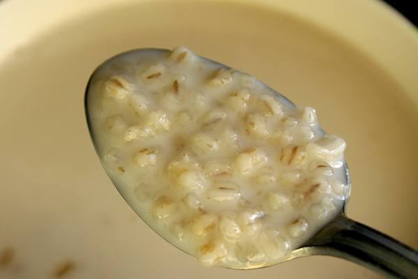 - Приготовление молочного завтрака из перловой крупы необходимо начинать с отмачивания зерен (2 стакана) в кипятке (2 л), либо с их предварительной и непродолжительной (10 минут) варки на воде.