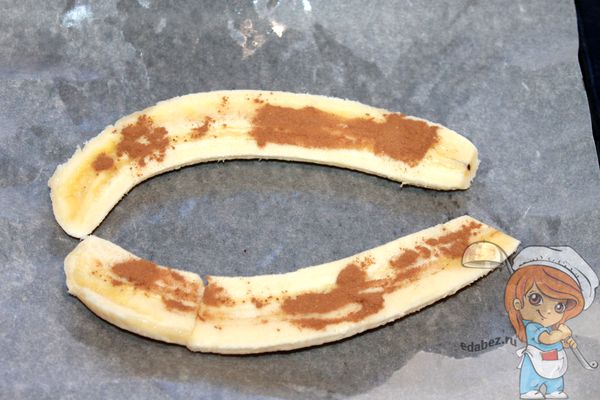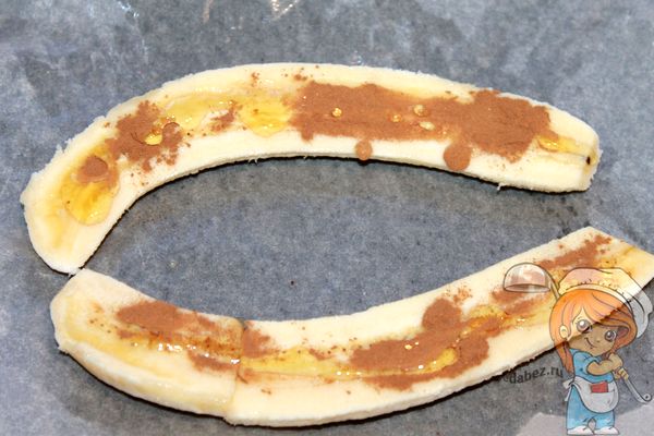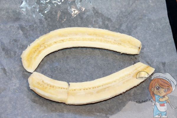 Банан разрезаем на две половинки и кладем на противень срезом вверх.