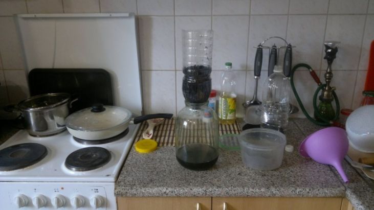 В готовую конструкцию не спеша заливайте дистиллят и ждите, пока он полностью не протечёт через фильтр. Для наилучшего результата советуется повторить процедуру 3-4 раза.