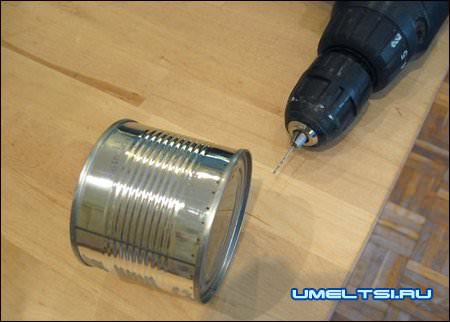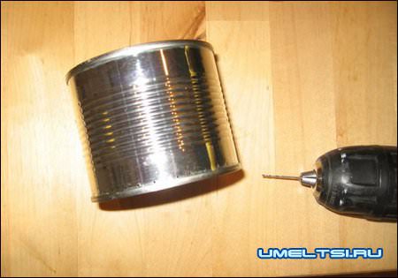 После этого необходимо высверлить ряд отверстий по бокам банки, у ее нижнего края. Отверстия должны быть как можно меньшими по диаметру, даже при отверстиях, диаметром один миллиметр некоторые сахаринки проходят сквозь них не успевая расплавиться. Поэтому воспользуйтесь сверлом самого маленького диаметра, какой только найдете. Сверление отверстий производите на высоте примерно одного сантиметра от нижнего шва банки.