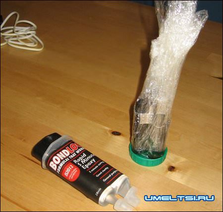 Подготавливаем подставку для зажигалки. Необходимо обернуть зажигалку пищевой пленкой минимум в два слоя. После чего замешайте немного эпоксидного клея, залейте его в молочную крышечку и поместите зажигалку в крышечку. После затвердения клея необходимо вынуть зажигалку и очистить ее от пленки. Съемная подставка для зажигалки готова.