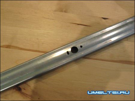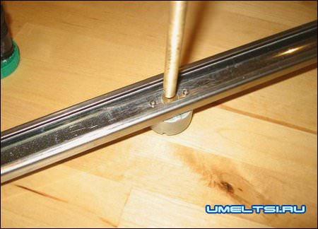 В завершение крепим двигатель к поперечной планке. Осуществить это достаточно просто, просверлите по центру планки два отверстия и закрепите двигатель двумя шурупами.