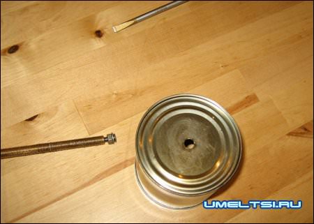 Просверлите отверстие в банке для ее крепления к пруту. Закрепите банку с помощью болта и гайки. В принципе банку можно просто припаять к металлическому пруту или прибить гвоздем, если планка деревянная. Но вариант крепления болтом с гайкой лучше, так как позволяет снимать, или заменять банку.