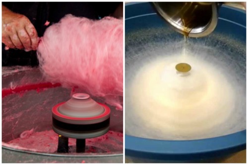 - От вращения нагретого диска сиропчик превращается в нити, которые распределяются по стенкам чаши;