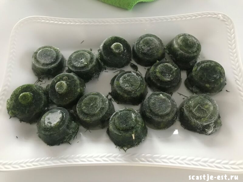 Зеленый лук я в формочках не заготавливала, но покажу вам как красиво выглядит замороженный таким образом укроп.