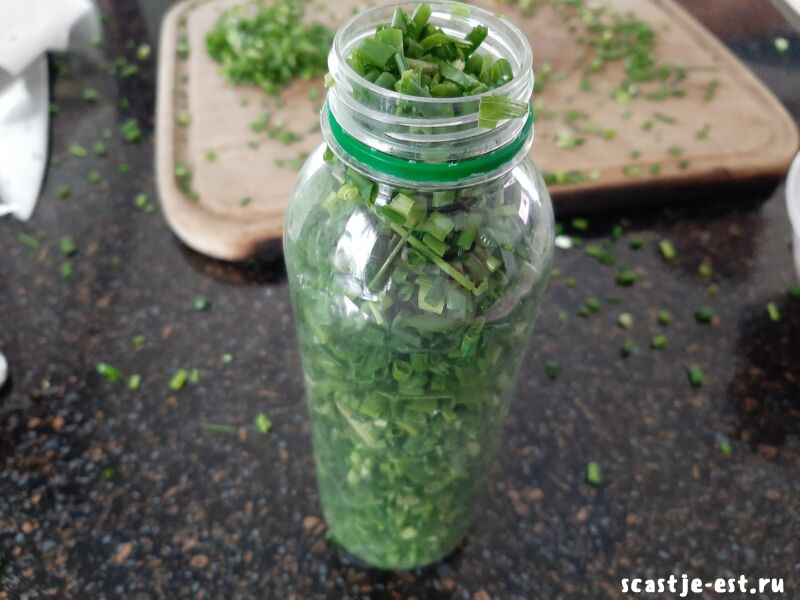 Еще один прекрасный вариант для хранения в морозильной камере — в небольших пластиковых бутылках. Емкость моей бутылки 0,5 литра, ну и горлышко должно быть широкое. Насыпаем в нее лук и закрываем крышкой.
