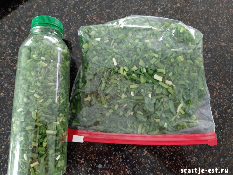 Размещаем пакеты, бутылочки в морозильной камере и достаем зимой по мере надобности. Такой лук прекрасно сохраняет аромат и вкус свежего, поэтому его смело можно использовать и в салатах, и в супах, и в пирогах.