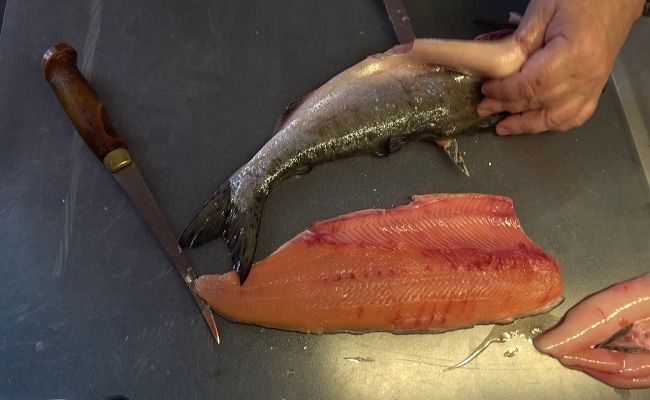 Чтобы получилось филе, нужно аккуратно срезать тонким ножом хребет с крупными боковыми костями, а затем при помощи пинцета повытаскивать косточки помельче. Также можно отрезать брюшки.