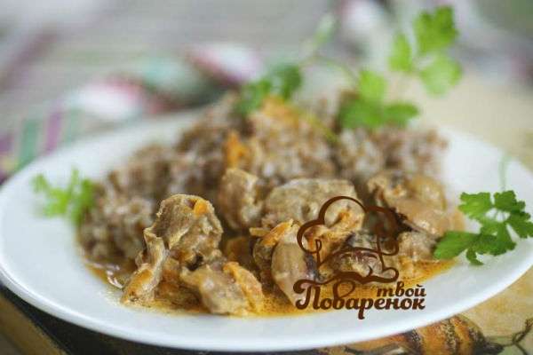 - Гречку перебираем и промываем и как желудки станут готовы высыпаем гречку к ним. Добавляем еще около 1 стакана воды (в зависимости от оставшейся жидкости), перемешиваем, накрываем крышку и тушим до готовности (около 20 минут).
