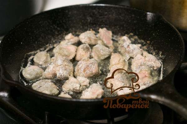 - Куриные желудки промываем, очищаем от пленок, нарезаем небольшими кусочками и тушим в глубокой сковороде с маслом, 25 минут.