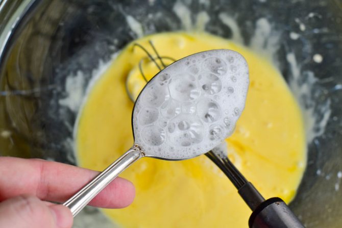 2. Соду выложите в большую ложку или же миску, погасите ее уксусом. Влейте ее в яичную массу.