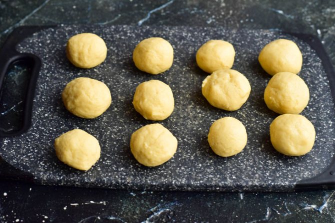 5. Из готового теста скатайте одинаковые и не слишком большие по размеру шарики (руки предварительно смочите водой).