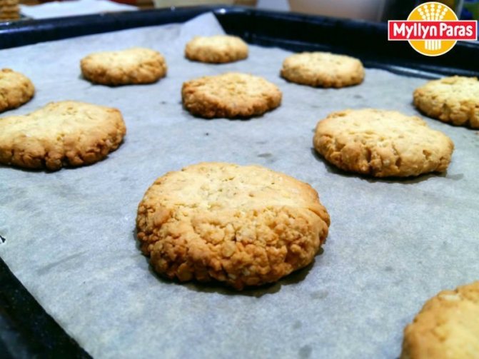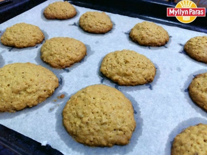 Далее необходимо постепенно ввести овсяные хлопья в тесто. Классический вариант требует хлопьев крупного размера, но можно выбирать овсянку разного помола, экспериментируя со вкусом этого десерта. Массу тщательно перемешать. Подготовленную массу разложить лепешками по противню и выпекать 15-20 мин. до готовности. Перед употреблением дать блюду полностью остыть.