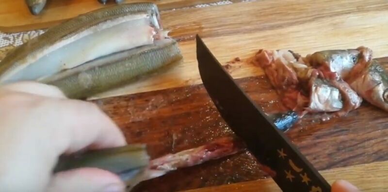 Отрезаем голову, хвост и плавники, разрезаем брюшко до самого хвоста, вытаскиваем внутренности, счищаем черную пленочку внутри брюшка.