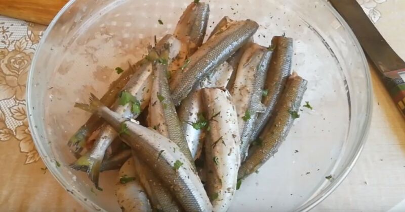 - Натереть корюшку солью и перцем по вкусу и оставить на полчаса для маринования.