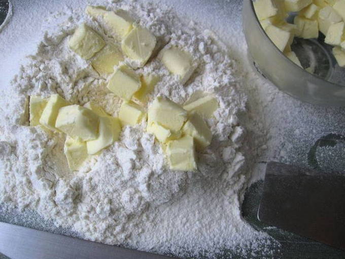 - Просеянную заранее муку смешивают с солью и нарезанным кубиками маслом. Массу рубят ножом, чтобы получилась крупная крошка.