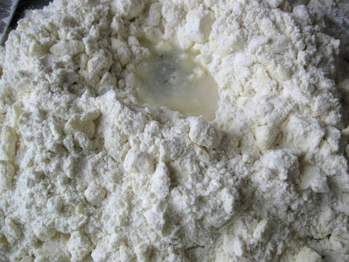 - Яйцо отдельно взбивают со столовой ложкой ледяной воды и вводят в масляно-мучную массу. Все быстро смешивают, покрывают тесто пленкой и кладут в холодильник на 60 минут.