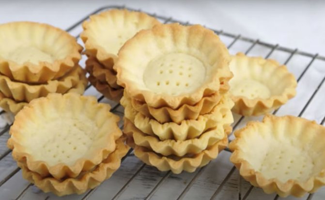 - Затем тесто раскатать, нарезать порционными кусочками и каждый выложить в форму для выпечки корзинок. Наколоть заготовки вилкой, чтобы не вздувались, и выпекать примерно 10 минут при 200 градусах.