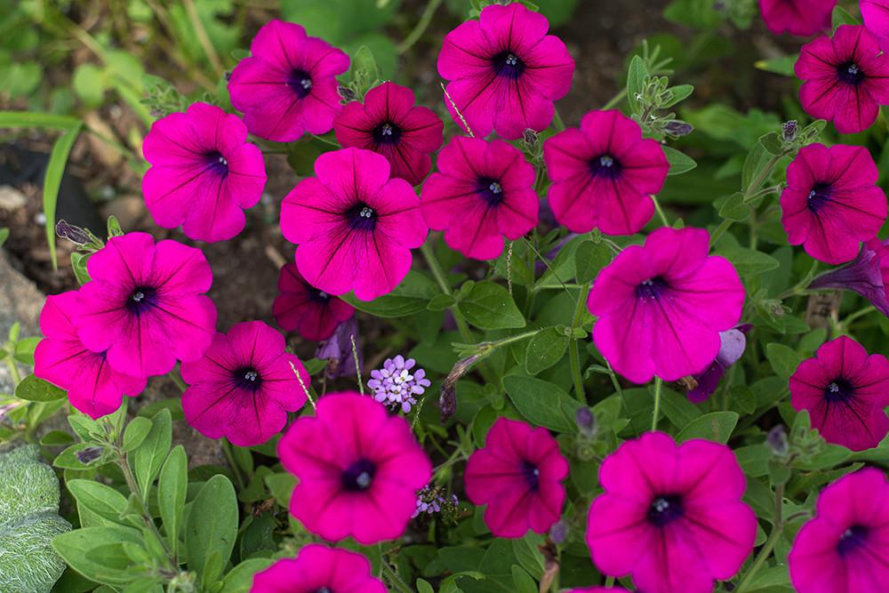- Петуния. Очень распространенная на российских дачных участках и балконах культура, хотя ее родина — Южная Америка. Многолетнее растение от 10 до 100 сантиметров высотой. Имеет крупные яркие цветы разнообразных расцветок, обычно одиночные, похожие на маленькие граммофончики.
