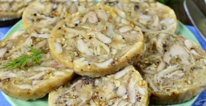 Смешиваем с глубокой емкости кусочки курицы с орехами и чесноком, вливаем желатиновый бульон, перемешиваем. Пробуем, если требуется, добавляем соль и специи. Перекладываем массу в бутылку, бутылку ставим в холодильник до полного застывания. После этого бутылку аккуратно разрезаем и снимаем. Нарезаем готовый рулет кружочками.