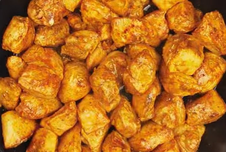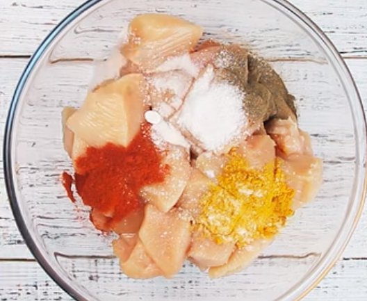 1. Нарежьте куриную грудку на небольшие кусочки. Если вы решили готовить крылышки или голени, то их можно оставить целыми. Положите курицу в миску и обваляйте в смеси черного перца, куркумы и паприки.