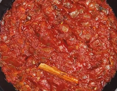 - Через час его подрумянивают на сковороде, в конце добавляют томатную пасту.